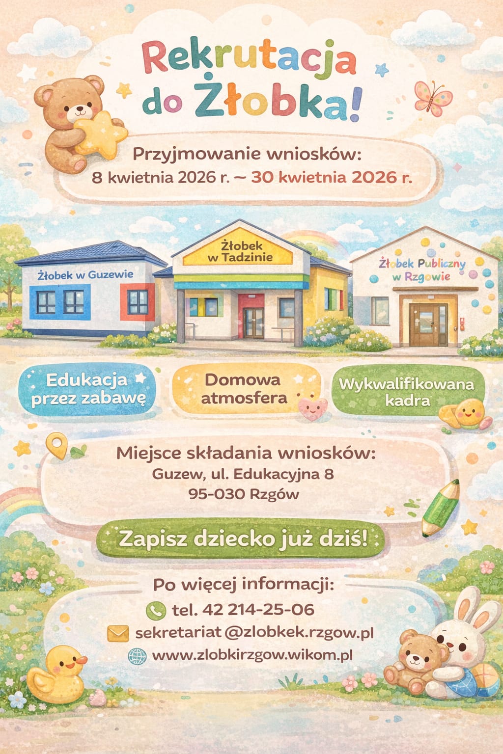 w dniach 8–30 kwietnia 2026 r. odbędzie się rekrutacja do Zespołu Żłobków Samorządowych Gminy Rzgów. Regulamin rekrutacji wraz z załącznikami znajduje się w zakładce REKRUTACJA.